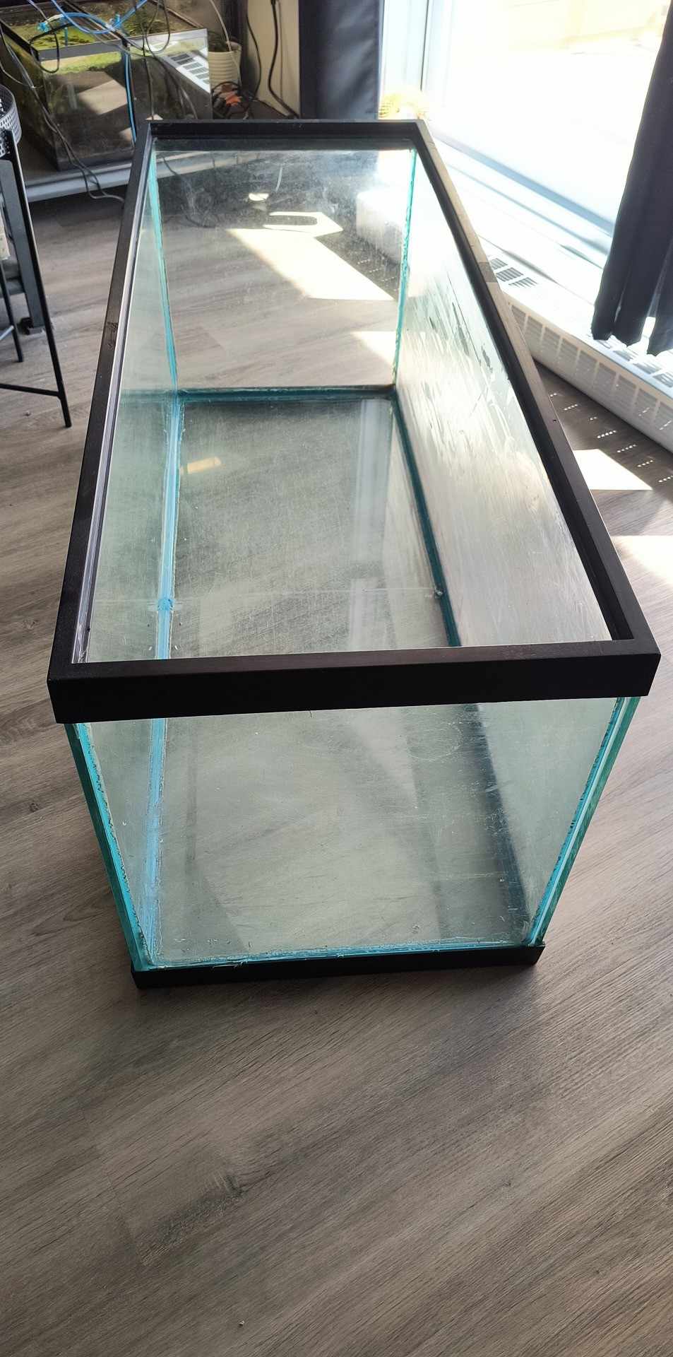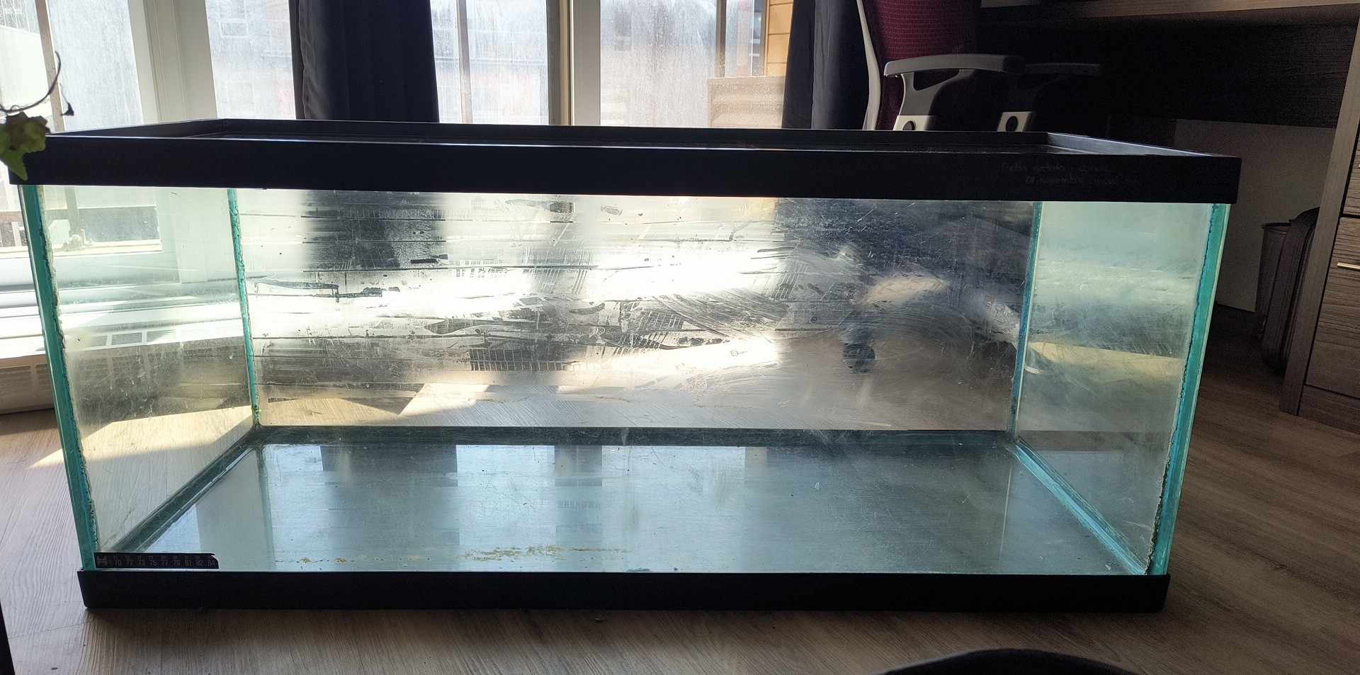 Un aquarium usagé qui a toujours été en eau (+ de trois ans d’utilisation selon l’ancienne propriétaire). Il a été vidé en février 2024. La vitre arrière possédait un arrière-plan noir d’où la colle qui est visible sur la vitre arrière (voir la photo).
